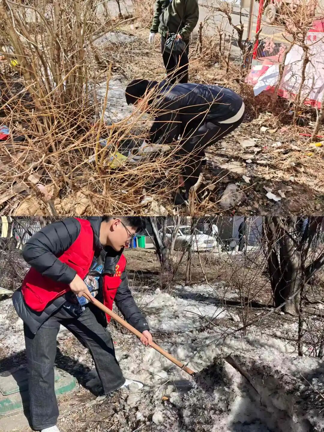 志愿者们身着统一服装,以饱满的热情分组投入到清扫工作中。大家深入学府家苑小区,清理院内垃圾、残冰积雪,细致铲除小广告,为居民打造干净舒适的生活空间;同时对国际教育学院友谊楼院内进行全面清扫,让校园环境焕然一新。